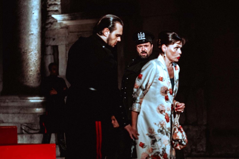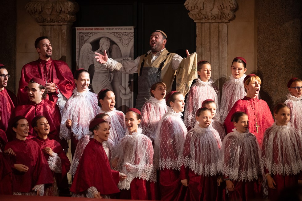Red je Peristil na Splitskom ljetu počastiti barem jednim kanonskim naslovom poput Tosce. Doduše, istim je otvoreno Ljeto 2023., ali neka – nakon maratona Dioklecijana, željezna opera koja davno zamišljeni programski kompas usmjerava pravim koordinatama. U odmaku dvije sezone ekipa za ovogodišnju Toscu je drugačija. Tko i što je isto: redatelj Goran Golovko je znalački i mudro iskoristio prostor trga da radnja ne pati te da gustoća drame ne doživi rasap ni u jednom trenutku. Poštovao je dinamizam glazbe, karaktere likova i nježno se naslonio na arhitekturu prostora i opere. Scenografija Marina Gozzea, kostimi Mladena Radovnikovića i oglavlja Ankice Matijaš izvrsno su nas vratili u realnost onodobnog trenutka. Svi su izgledali usklađeno; mali prigovor ide kostimima za ženski dio zbora koji je u liturgijskom pluvijalu u nekim čudnim mitrama, što ne priliči spolu ni službi. Zborovođa Maro Rica je temeljito i muzikalno pripremio zbor; Te Deum kao središnji zborski broj i Va, Tosca! – arija Scarpije potpomognuta zborom, djelovali su sigurno i vokalno čvrsto.