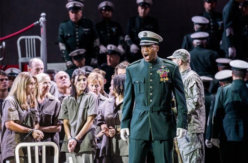 Još jedan jasan znak da redatelj govori o tri gore spomenute države jest zid boli s imenima palih boraca za koje čelična lady režima, utjelovljena u liku Amneris, smatra normalnim da polože život za vladajuću garnituru koja je povlaštena. Vidi se to po njenom hladnom stavu prilikom polaganja vijenaca na spomen-područje. Zastava kojom cijelo vrijeme mašu vojnici dok se postrojavaju po pozornici neodoljivo podsjeća na državni simbol Sjeverne Koreje, a nose ih i u plesu tijekom Trijumfalnog marša, u odličnoj koreografiji Rebecce Howell. Dakako, tu su i slike Kralja i Radamesa (drugu na zid stavlja opčinjena Amneris, a kada mu priprema večeru za povratak iz rata, stol postavljaju njezine sluškinje kojih ima neograničeno mnogo), jedan od glavnih motiva totalitarizma i izgradnje kulta ličnosti. Pred spomenutim spomen-obilježjem vidimo i vječni plamen koji za Carsena očito predstavlja totalitarni državni ustroj. Jednoumlje je uvijek predstavljalo mračna razdoblja ljudske povijesti pa se predstava odvija pod zagasitim svjetlom koje su oblikovali Peter van Praet i Robert Carsen. Režija Roberta Carsena neće se svidjeti konzervativnoj publici, a i koncept je prenaglašen. Neovisno o tome, ideja je zanimljiva, detaljno razrađena i u skladu s aktualnom geopolitičkom situacijom te kao takva zaslužuje ovakvo izdanje kao odraz vremena u kojem je nastala.