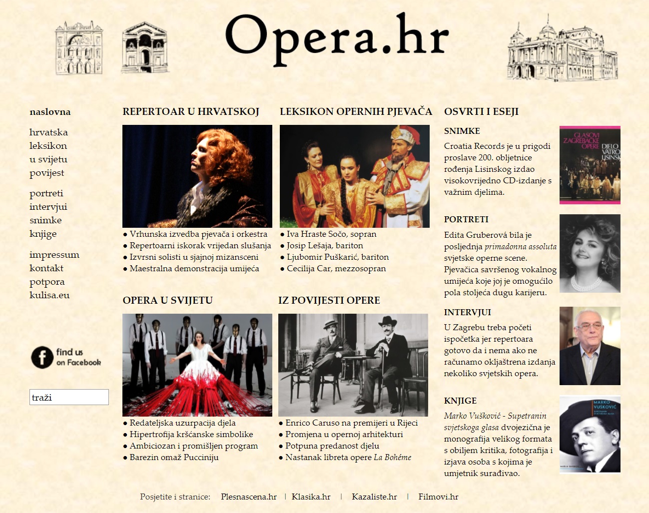 Opera.hr temeljitije, potpunije, ažurnije i vizualno bogatije od tiskanih novina pridonosi praćenju i kritičkoj valorizaciji operne umjetnosti u Hrvatskoj. Smatramo da upravo kulturne internet stranice svojim neograničenim prostorom za tekstove i fotografije, sveopćom dostupnošću za sve korisnike interneta, ažurnošću i jedinstvenom umreženom strukturom mogu najbolje odgovoriti potrebama današnjih ljubitelja opere.