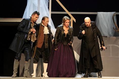 U ulozi Grofice nastupila je sopranistica Ingrid Haller. Prvim svojim nastupom u ariji Porgi amor kojom se otvara II. čin opere pokazala je nemogućnost fraziranja zbog nekvalitetne proizvodnje tona neurednog vibrata. Intonacijski problemi, koji su obilježili nastupe više pjevača, najviše su došli do izražaja u završnom allegru arije Dove sono u III. činu s tek otprilike obuhvaćenim visinama (a2), no treba priznati da su visoki c bili uspješno dosegnuti u tercetu Susanna or via sortite (Grof, Grofica, Susanna) iz II. čina. Općenito je njeno pjevanje u pianu bilo prigušeno i s nedovoljnom količinom glasa. Redateljičinom viđenju lika Haller je odgovorila solidno, ali s nedovoljno plemenitosti. Kao Grof nastupio je talijanski bariton Oliviero Giorgiutti umjesto ranije najavljenog Roberta Kolara, člana ansambla. Budući da je redateljica njegov lik zamislila jednodimenzionalno negativnim, a kostimom je prije bio Macbeth nego Grof Almaviva, u portretiranju svoje role nije imao zahvalnu ulogu. Nemiran ton i odsustvo legata lišili su pjevanje, koje je bilo ružno, potrebnog belcanta. Na kraju arije Vedrò mentre io sospiro neuredno je donio frazu u triolama, a baritonski visoki fis bio je bez ljepote i sjaja.Mlada mezzosopranistica Iva Krušić pjevala je Cherubina bez incidenata i s ukusnom ornamentacijom u Cherubinovoj drugoj ariji Voi che sapete, ali nedovoljno razvijenim glasom, bez punoće tona i sa stanovitom nesceničnošću u ulozi koja traži izvrsnu glumicu nije udovoljila standardu koji bi trebala njegovati jedna operna premijera. U talijanskim izvedbama opere Cherubina je pjevala članica riječkog ansambla Ivana Srbljan koja naposljetku nije postala dijelom podjele riječke predstave. Marcellinu i Don Basilija/Don Curzija (ove uloge u Mozartovo vrijeme pjevao je jedan pjevač, kao i Bartola i Antonija, premda ih u suvremenim izvedbama redovito tumače različiti pjevači) pjevali su Olga Kaminska i Sergej Kiselev, članovi ansambla koji više ne mogu nositi repertoar. Kaminska je bila Marcellina nekvalitetnog tona i slabog donjeg registra, često nečujna u ansamblima, dok je Kiselev također nastupio bez dovoljno glasovne supstancije, zvučeći nazalno. Potrebna doza komike u ulozi Don Basilija nije bila sasvim ostvarena. Čak bi i puristi stoga bili zadovoljni što su iz IV. čina ispuštene Marcellinina i Basilijeva arija koje su se i inače u 20. stoljeću redovito ispuštale iz izvedbi, ali u našem se vremenu sve više izvodi barem jedna od tih arija.
