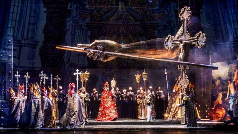 Kako bi ostao vjeran ideji, u scenografskom segmentu predstave u sva tri čina na pozornici je zadržao veliku ruku sa žezlom koja simbolizira moć koja s nekih viših pozicija ugnjetava ljude koji se samo žele prepustiti ljubavi i pozitivnim emocijama. Opisana ruka vrlo je definirano izrezbarena s jasnim konturama mišića, što u prenesenom značenju znači da se vrlo dobro zna tko su ugnjetavači i odakle im moć. Poseban doživljaj u prvom činu proizvele su i vjerske amajlije. Iznimno je efektno kako se neposredno prije Te Deuma veliko raspelo podiže uz pomoć tehnike, jer do Te Deuma crkva je služila kao poligon za progon nepoćudnih, a za molitvu se prilagođava kako bi ispunila svoju primarnu i po mogućnosti jedinu svrhu. Odlične su i video-projekcije, a posebno ona na početku trećeg čina koja nas najbolje uvodi u atmosferu scenske situacije koja slijedi. Gledatelju može na momente zasmetati mrežica koja je cijelo vrijeme spuštena preko scene, ali je to iz režijskih razloga itekako opravdano.