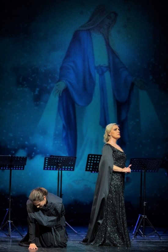 Kako rekoh, splitska izvedba je bila kostimirana koncertna, ali snaga teme i partiture nije zbog toga bila oslabljena. Dvije glavne uloge, sopranistica Antonija Teskera kao Sestra Angelika i mezzosopranistica Terezija Kusanović kao njezina tetke, bogata kneginje, dale su temeljni doprinos dobroj realizaciji djela. Terezija Kusanović je vokalno i glumački (koliko su joj okolnosti dopuštale) suvereno donijela na scenu hladnu, otmjenu i sudbinski bešćutnu kneginju koja vrhunac razočaranja i sablažnjenja nad svojom nećakinjom pjeva u ariji Nel silenzio di quei raccoglimenti. Volumenom alta i bojom dramskog mezzosoprana „presudila“ je raspadu duševnog stanja svoje nećakinje i ispratila tijek opere u mračne predjele duha. S druge pak strane, Teskera je pokazala poseban senzibilitet za hermetičnu i duboko internaliziranu ulogu Angelike, raskajane žene koja nakon saznanja o smrti djeteta želi umrijeti i pridružiti se svom čedu na nebu (nadahnuto otpjevana arija Senza mamma). Popivši otrov radosno se oprašta od života ne uzevši u obzir dio jednadžbe svete dogme da joj samoubojstvo odnosi dušu u pakao i vječnu razdvojenost od djeteta. Na kraju joj je molba Bogorodici uslišana i dijete je vodi sa sobom u nebo, u vječno zajedništvo- iskupljenje u snažnoj molitvi priključilo ju je anđeoskom zboru. Nije bilo jednostavno vokalno pronijeti sav emotivni raspon uloge, ali očito je da se Teskera doista tome posvetila i na koncu pružila publici jednu iskrenu, makar ne u tehničkom smislu najčišću, Angelicu koja je nesporno ostavila dobar dojam.