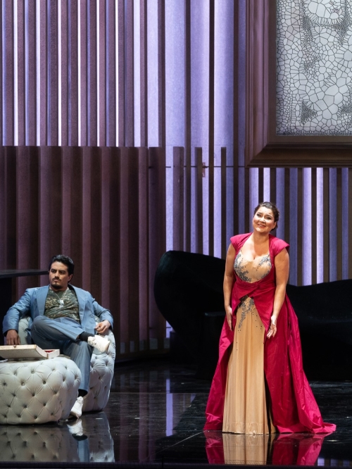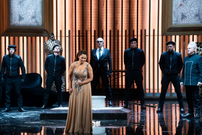 Guy Montavon napravio je odličan posao s pjevačima, a posebno s Lanom Kos. Imao je na raspolaganju snažnu scensku pojavnost koja je mogla odgovoriti zahtjevima režije, posebno u drugom i četvrtom činu. Redatelj je oblikovao i svjetlo, dok je za odličnu scenografiju bio zadužen Hank Irwin Kittel. Posebno je spektakularan drugi čin, a niti prvi ne zaostaje. Režiju su pratili i primjereni kostimi Kristophera Kempfa. Riječ je o produkciji koja je rađena u koprodukciji s Monte Carlom, u kojoj je u last minute angažmanu nastupila Anna Netrebko (bila je pod zapadnim embargom zbog Putinove agresije na Ukrajinu i bez angažmana pa ju je u tom zrakopraznom prostoru angažirala opera u Monte Carlu) i riječ je o zaista odličnoj predstavi koja, koliko smo vidjeli po popunjenosti kazališta na posljednjoj predstavi, nije naišla na posebno odobrenje tradicionalne tršćanske publike. Opisano je velika šteta jer je riječ o dobro koncipiranom kazališnom doživljaju, uz izuzetak četvrtog čina.