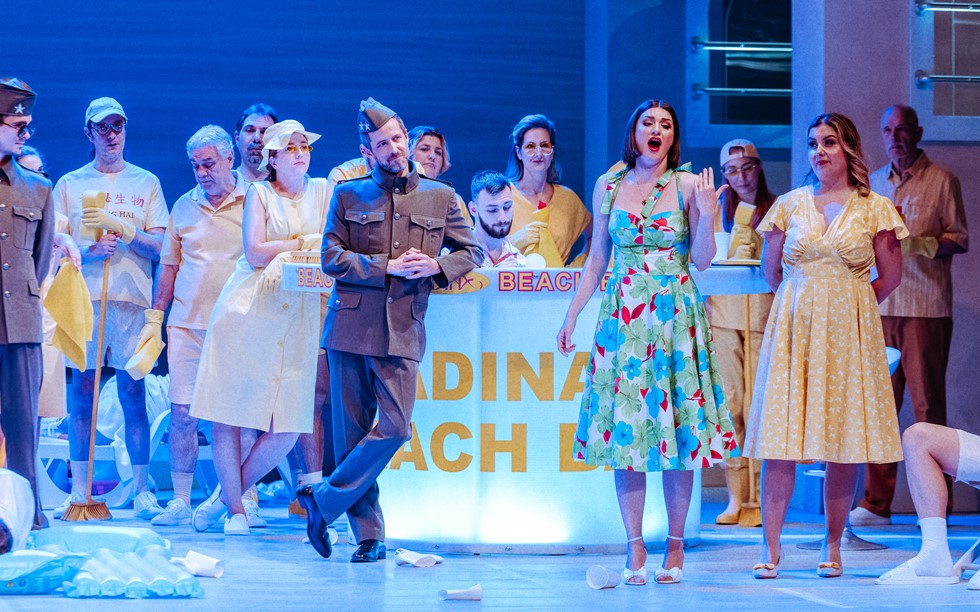 Peta, recentna splitska premijera načelno za – pet! Redatelj Goran Golovko poslužio se korištenim modelom i izmjestio radnju iz Italije Donizettijevog vremena u turistificirani, merkantilistički Split. Doduše, Donizetti je Baskiju izvornog libreta iz srednjovjekovne legende zamijenio sjevernom Italijom. Ne navodim ovaj podatak kao temelj ideje redatelja Golovka – njegovo uprizorenje zaslužuje isključivo pohvalu jer je uspio implementirati zamisao u cijelosti na scenu. Zbor je u prvom činu u žutim kostimima, naoružan četkama, usisavačima, kantama, rukavicama… redom sezonskim materijalom za čišćenje turističkog smještaja. Scenograf Marin Gozze uredio je tri Adinina apartmana, recepciju, beach bar, bazen, sunčalište i dakako – u pozadini dvije znakovite kulise brodova koji se smjenjuju lukom: kruzer i nosač aviona. Adina je s iPadom u ruci, bukira goste, a Nemorino radi neki lošije plaćen posao u turizmu. Kostimi Mladena Radovnikovića su točka na i ukupnoj kulisi. Studenti glume splitskog UMAS-a dali su važan prinos u dinamici i razigravanju scene kao turisti, vojnici, barmen, bilježnik…
