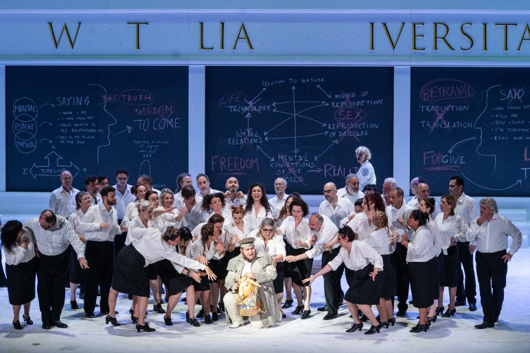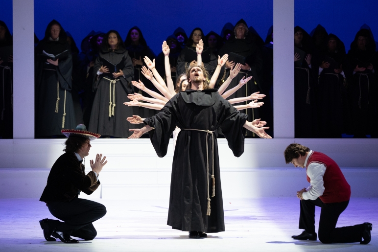 Zbor Teatra Verdi emitirao je moćan ton širokog luka s posebnim naglaskom na muški korpus. Zborske dionice jasno su definirane te zbor funkcionira kao aktivni akter i istovremeni komentator radnje. Zborovođa je Paolo Longo.