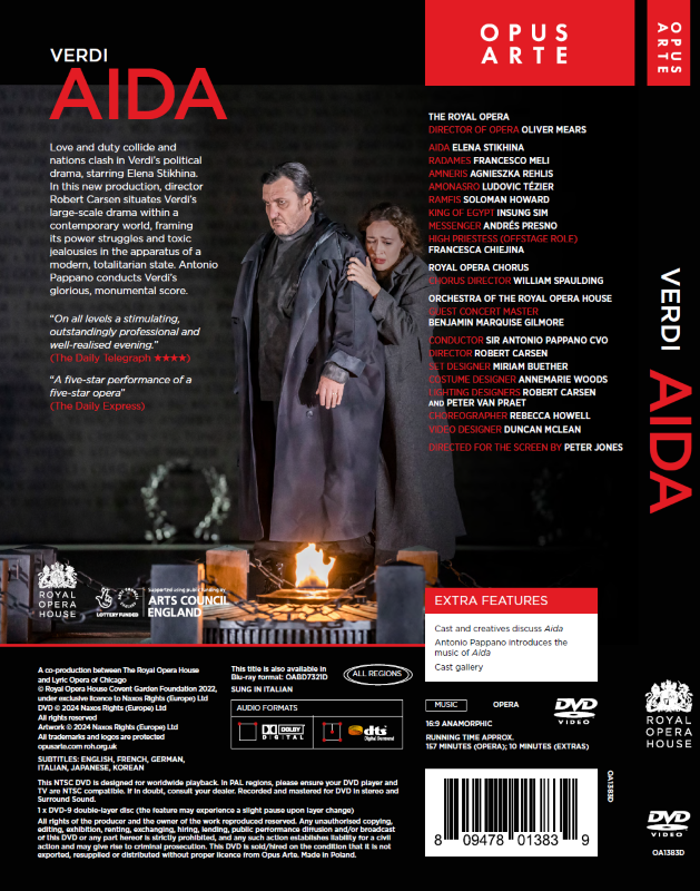 Ususret premijeri opere Aida Giuseppea Verdija u HNK u Zagrebu, koja je zakazana za petak 27. veljače ove godine, zavirili smo u kućnu opernu kolekciju i potražili posljednje DVD-izdanje ovog popularnog naslova koji je rasprodao gledalište za sve najavljene izvedbe u središnjoj nacionalne kazališnoj kući danima prije premijere. Posljednje, nama poznato izdanje Aide objavila je britanska diskografska kuća OPUS ARTE koja djeluje pod okriljem NAXOS MUSIC GROUP. Predstava je premijerno izvedena 2022. u režiji Roberta Carsena i pod dirigentskim vodstvom Sir Antonija Pappana, a nosač zvuka i slike o kojem pišemo na tržištu se pojavio krajem lipnja 2024. OPUS ARTE agilno je diskografsko poduzeće koje se fokusira na izvedbe na otoku (Royal Opera House), a osim opernih i baletnih naslova producira snimke dramskih predstava nastalih iz pera Williama Shakespearea, a izvedenih u legendarnom Globe Theatre ili u okviru Royal Shakespeare Company. Dakako, ne pohranjuju na nosače zvuka i slike samo produkcije nastale u Britaniji, nego i u Nizozemskoj, Španjolskoj, itd.