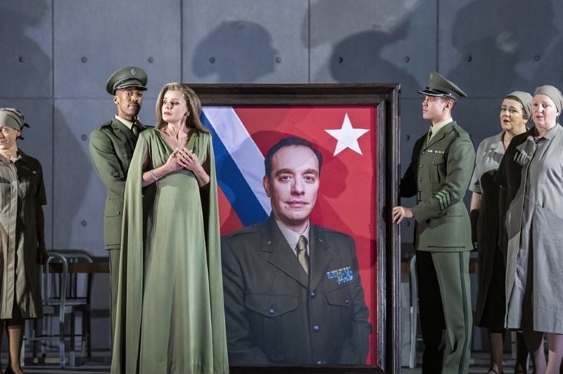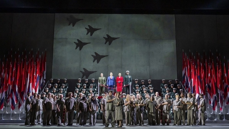 Još jedan jasan znak da redatelj govori o tri gore spomenute države jest zid boli s imenima palih boraca za koje čelična lady režima, utjelovljena u liku Amneris, smatra normalnim da polože život za vladajuću garnituru koja je povlaštena. Vidi se to po njenom hladnom stavu prilikom polaganja vijenaca na spomen-područje. Zastava kojom cijelo vrijeme mašu vojnici dok se postrojavaju po pozornici neodoljivo podsjeća na državni simbol Sjeverne Koreje, a nose ih i u plesu tijekom Trijumfalnog marša, u odličnoj koreografiji Rebecce Howell. Dakako, tu su i slike Kralja i Radamesa (drugu na zid stavlja opčinjena Amneris, a kada mu priprema večeru za povratak iz rata, stol postavljaju njezine sluškinje kojih ima neograničeno mnogo), jedan od glavnih motiva totalitarizma i izgradnje kulta ličnosti. Pred spomenutim spomen-obilježjem vidimo i vječni plamen koji za Carsena očito predstavlja totalitarni državni ustroj. Jednoumlje je uvijek predstavljalo mračna razdoblja ljudske povijesti pa se predstava odvija pod zagasitim svjetlom koje su oblikovali Peter van Praet i Robert Carsen. Režija Roberta Carsena neće se svidjeti konzervativnoj publici, a i koncept je prenaglašen. Neovisno o tome, ideja je zanimljiva, detaljno razrađena i u skladu s aktualnom geopolitičkom situacijom te kao takva zaslužuje ovakvo izdanje kao odraz vremena u kojem je nastala.